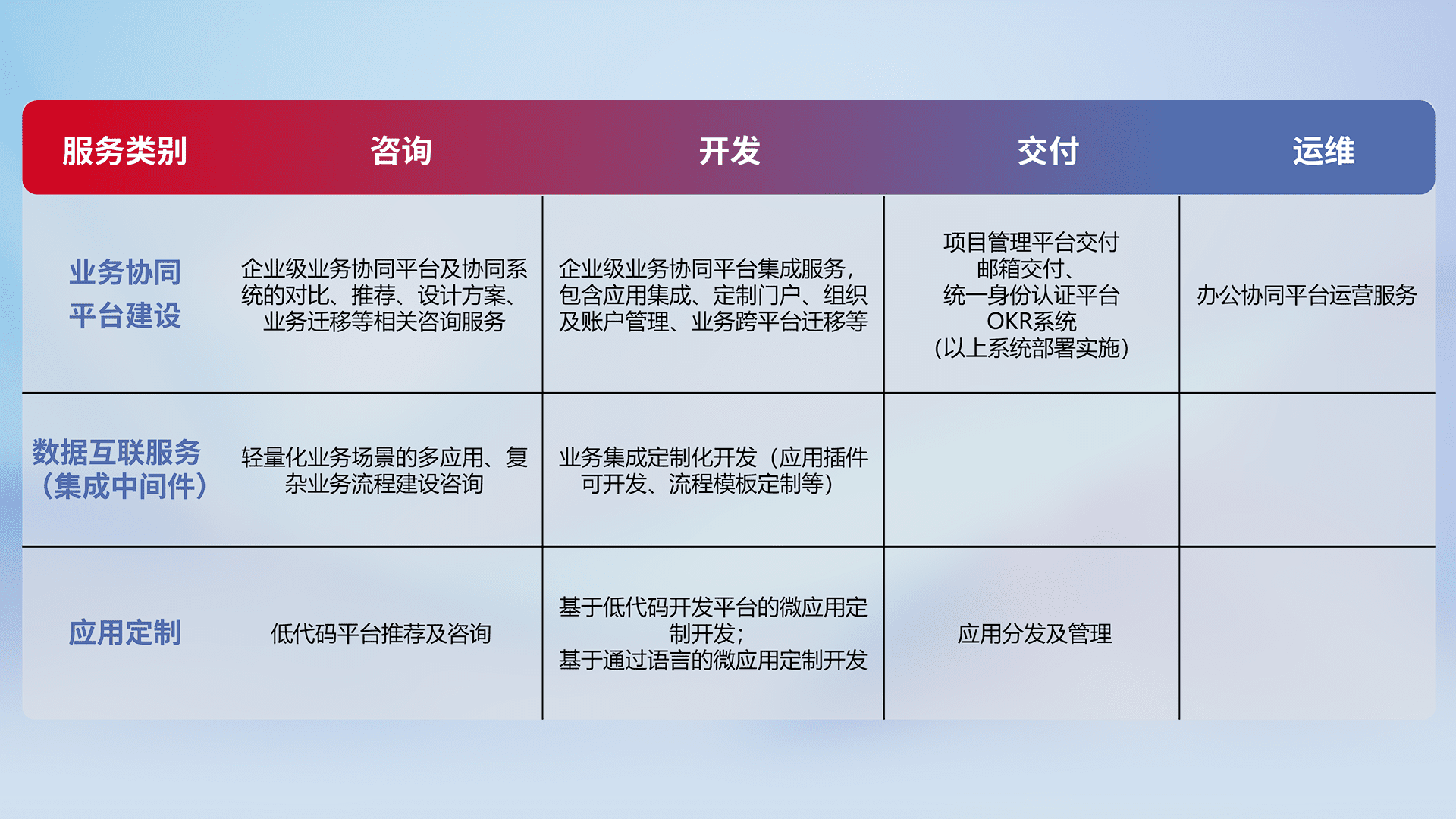 针对钉钉、、企微、、IDaas等平台级产品提供产品的规划、、方案、、、交付、、、定制化开发等服务,,,,实现如统一协同办公、、、、智能客户服务、、混合会议管理、、智能数据查询、、、、等业务场景,,,,实现数字化转型。。。