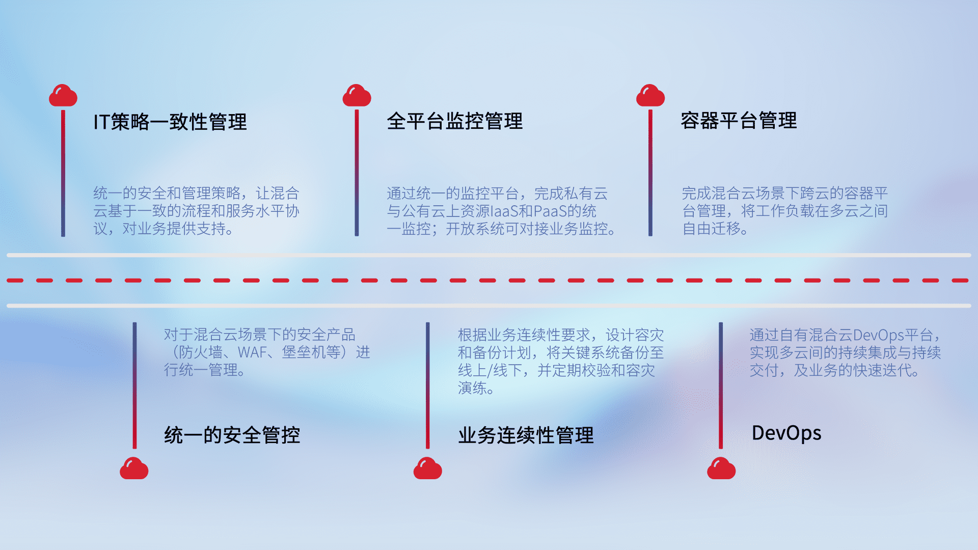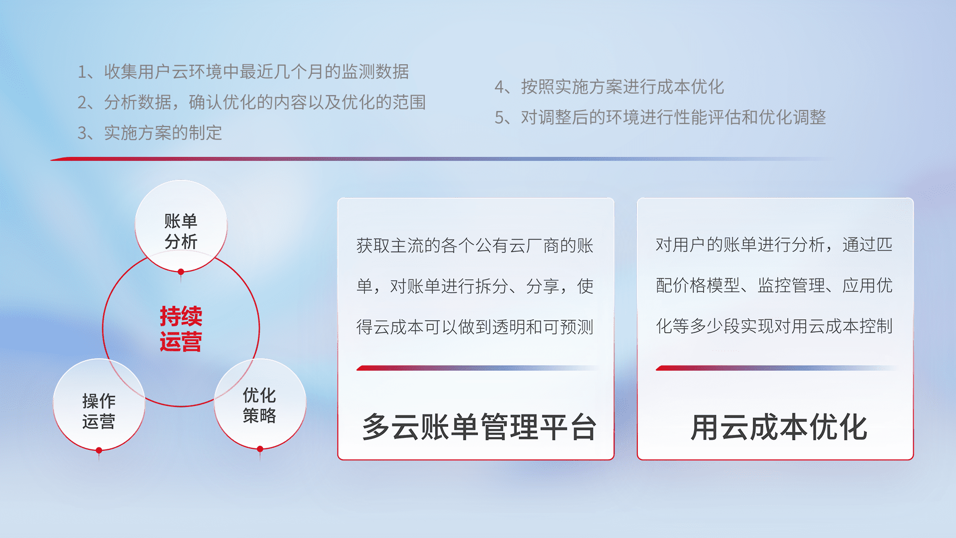 通过多云纳管,,以统一的资源数据模型把客户的云资源进行抽象和封装,,,进而实现对多云资源的统一操作,,,保障云资源管理的可靠性、、、稳定性与可用性。。。量身定制化运维内容,,,,配置、、、、开发运维、、、补丁管理、、备份、、、监控、、认证和访问管理、、、、审计和日常巡检等,,保障在用云过程中的可靠度,,,,稳定度以及高可用率。。。。